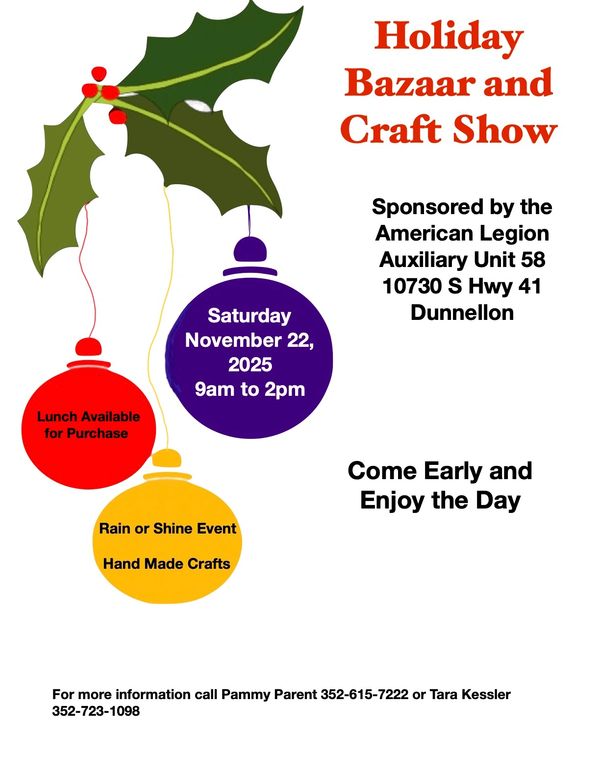 Join us on November 22, 2025, 9am-2pm, at The American Legion, Post 58, 10730 South US HWY 41, Dunnellon, FL 34431. We are calling all crafters that make hand-crafted items, including chocolates.
